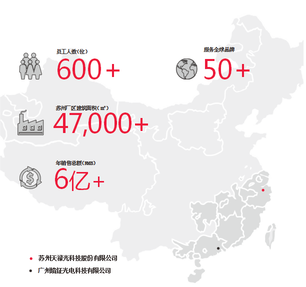 蘇州天祿光科技股份有限公司成立于2010年11月,主要從事生產(chǎn)、 銷售、研發(fā)光電導(dǎo)光板及相關(guān)零組件,2021年主營業(yè)務(wù)收入超8億元。2013年我司在相城區(qū)黃埭鎮(zhèn)委、鎮(zhèn)政府,相城區(qū)委、 區(qū)政府的大力優(yōu)惠的招商引資政策上購置了45畝工業(yè)用地。并建成工業(yè)用房47000平方米,現(xiàn)已正式投入使用。